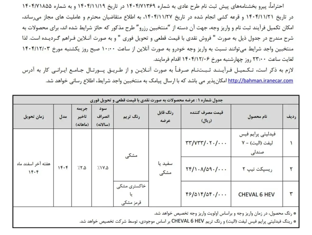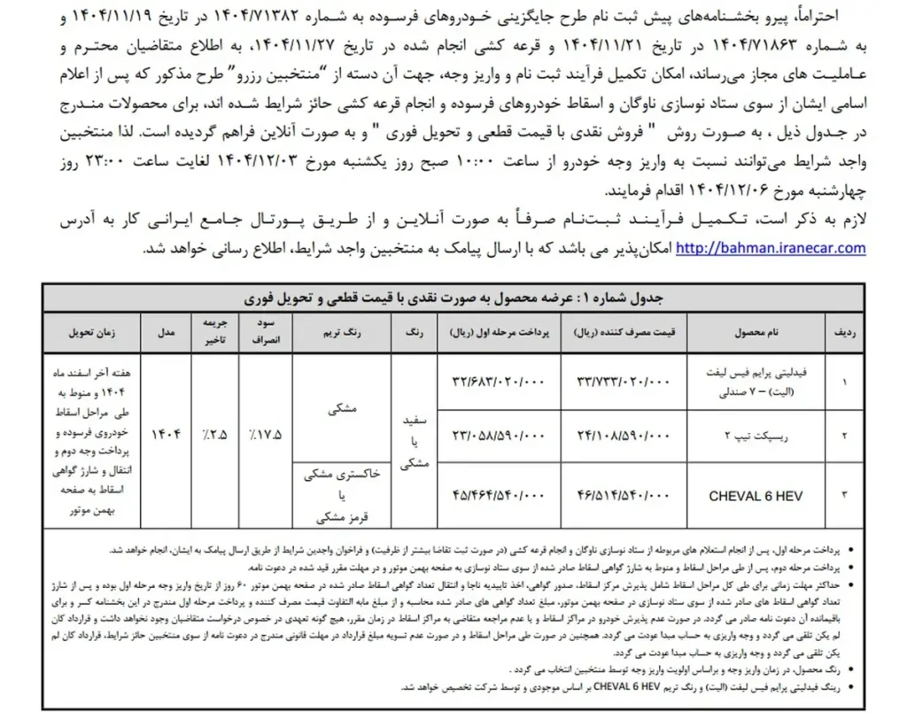 نهمین دوره واریز وجه محصولات بهمن موتور ویژه منتخبین رزرو بهمن ماه ۱۴۰۴